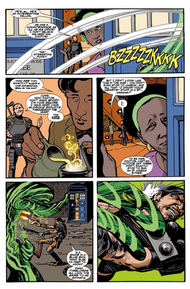 The breathless chase through time and space continues, with the Doctor and Alice on the run over a crime committed by one of his previous incarnations! This issue - things get complicated, quick, as a chainsword-wielding freelancer boards the TARDIS. Is he friend, foe, or something even worse?! With only minutes left before the implant in Alice's head gives their location away to the transtemporal bounty hunters on their tail, the Doctor won't have time to weigh his options - and the consequences will be heavy!