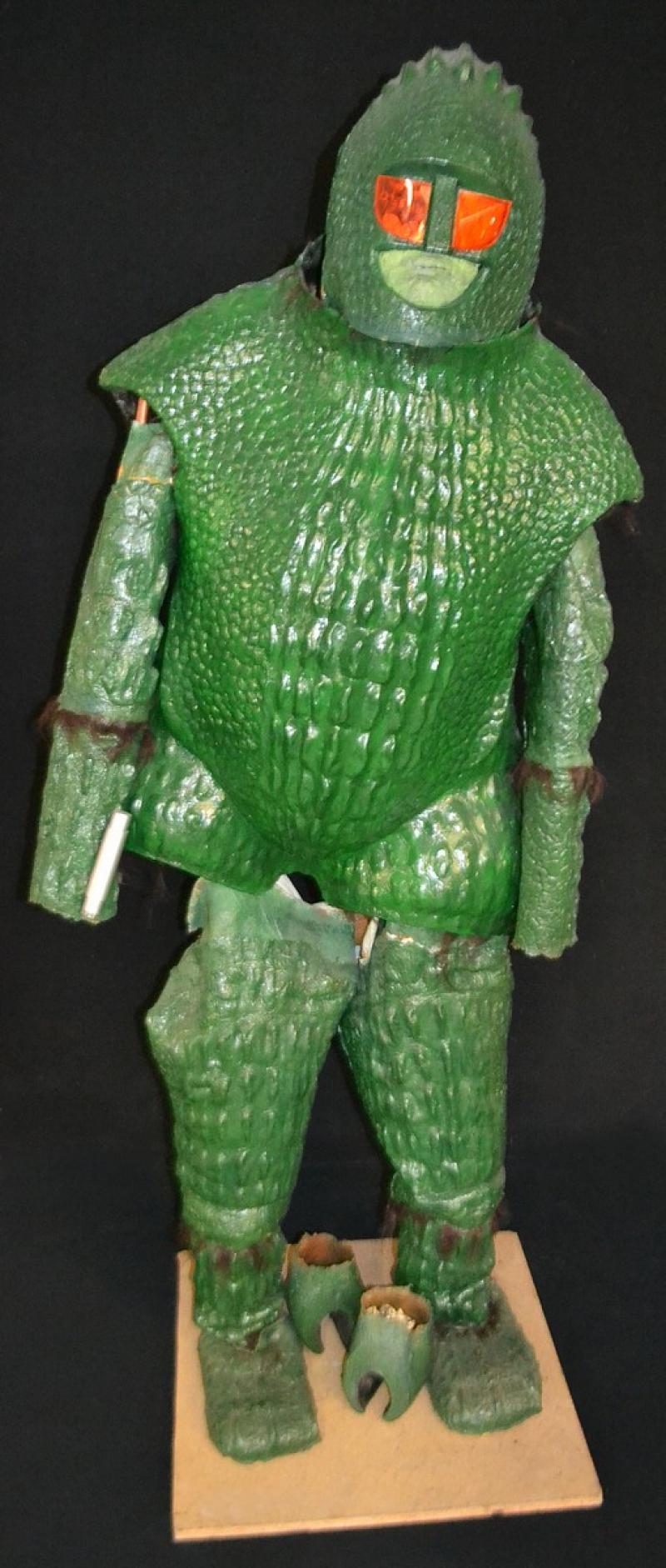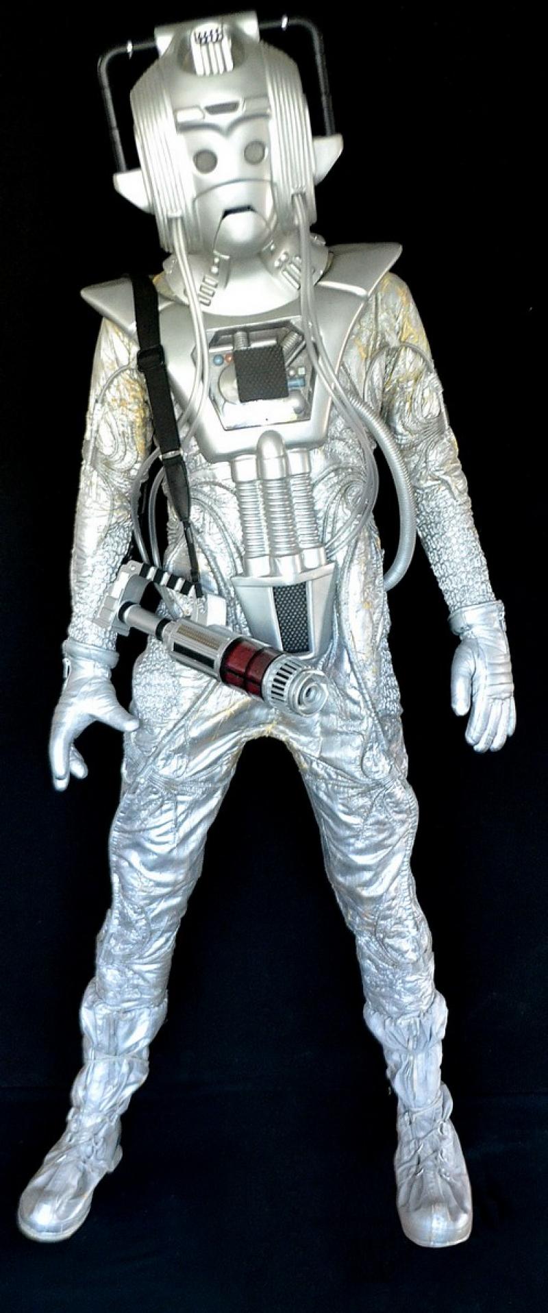 Items include a Cyberman costume from the 1982 story Earthshock; a Thal space suit costume from the 1973 story Planet of the Daleks; a space pack worn by Peter Davison in the 1983 story Enlightenment; a Dalek Trooper costume from the 16984 story Resurrection of the Dalek; a Magma Beast costume from the 1984 story The Caves of Androzanii; a Soldeed costume from 1979 story The Horns of Nimon; an Ice Warrior costume from the 1974 story The Monster of Peladon; and a Mara Snake Effigy from the 1983 story Snakedance.