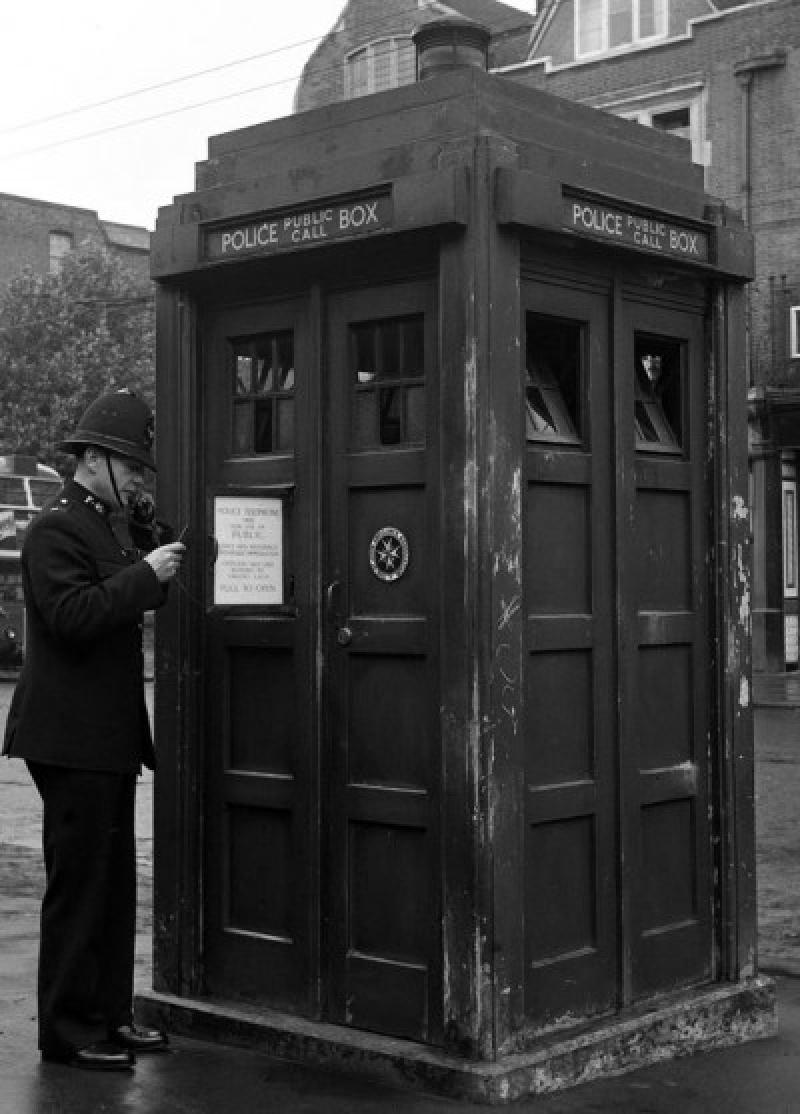 The place was Lime Grove Studio D, the studio which would become the main home of Doctor Who for its first few years of production. The main purpose of the day was to try to achieve an effect of the Doctor's spaceship, the TARDIS, dematerialising. The TARDIS prop had been built in the shape of a Metropolitan Police box, as specified in the script by Anthony Coburn. Police boxes were a common sight in 1960s London, with more than 650 in the capital. They played an important role in police work, providing a means of communication in the days long before the two-way radio. Designed by Metropolitan Police Surveyor Gilbert MacKenzie Trench in 1929 specially for the London police, the boxes were made of concrete with a door of teak. The interiors of the boxes normally contained a stool, a table, brushes and dusters, a fire extinguisher, and a small electric heater.