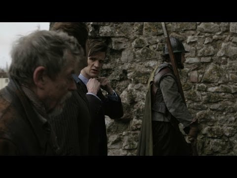 The short sequence shows the three Doctors - as portrayed by Matt Smith, David Tennant, and John Hurt - bickering and with their feet shackled, while being led under guard into the Tower of London.