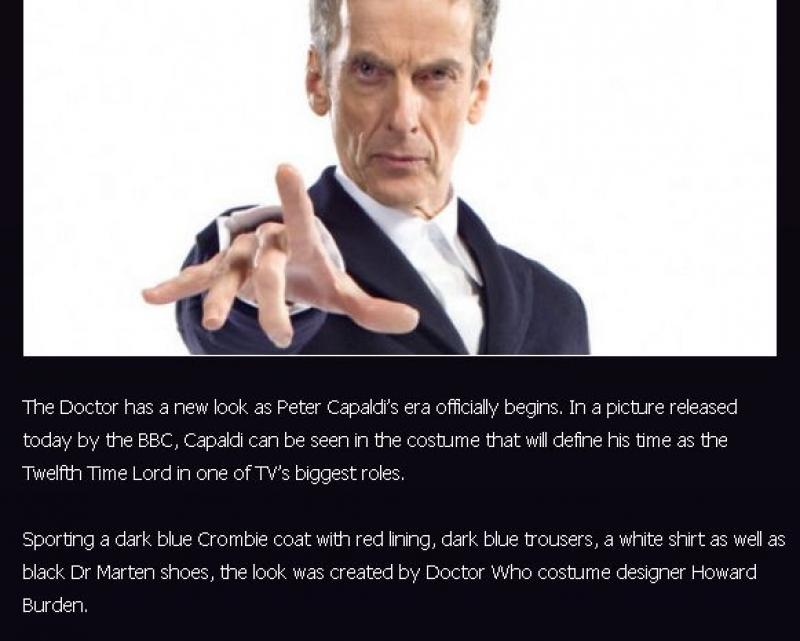 The new outfit has been deconstructed in a Telegraph online piece in which Crombie is reported as saying that it didn't make Capaldi's coat, although it was labelled a Crombie coat by the BBC. However, this could simply be a case of the coat having been made out of Crombie cloth. According to the online piece, Crombie has provided the BBC's costume department with several coats for the new series.