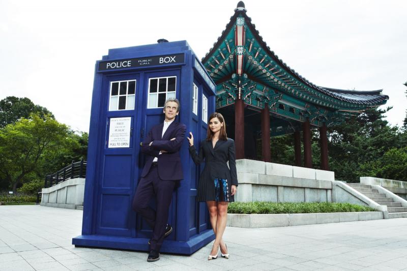 Peter Capaldi, Jenna Coleman and the TARDIS at the historic Bosingak bell at the National Museum of Korea. (Doctor Who World Tour - Seoul) (Credit: BBC Worldwide)