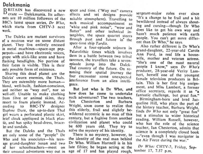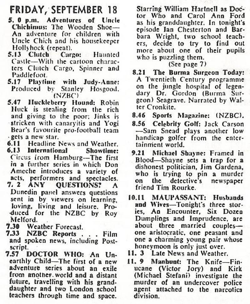 The country in question was New Zealand, with the Doctor's very first appearance outside the United Kingdom to be broadcast by Christchurch's CHTV-3. The episode was shown at 7:57pm, sandwiched between news programme NZBC Reports... and a documentary about Dr. Gordon Seagrave, The Burma Surgeon Today, and was introduced by the weekly magazine The New Zealand Listener as: