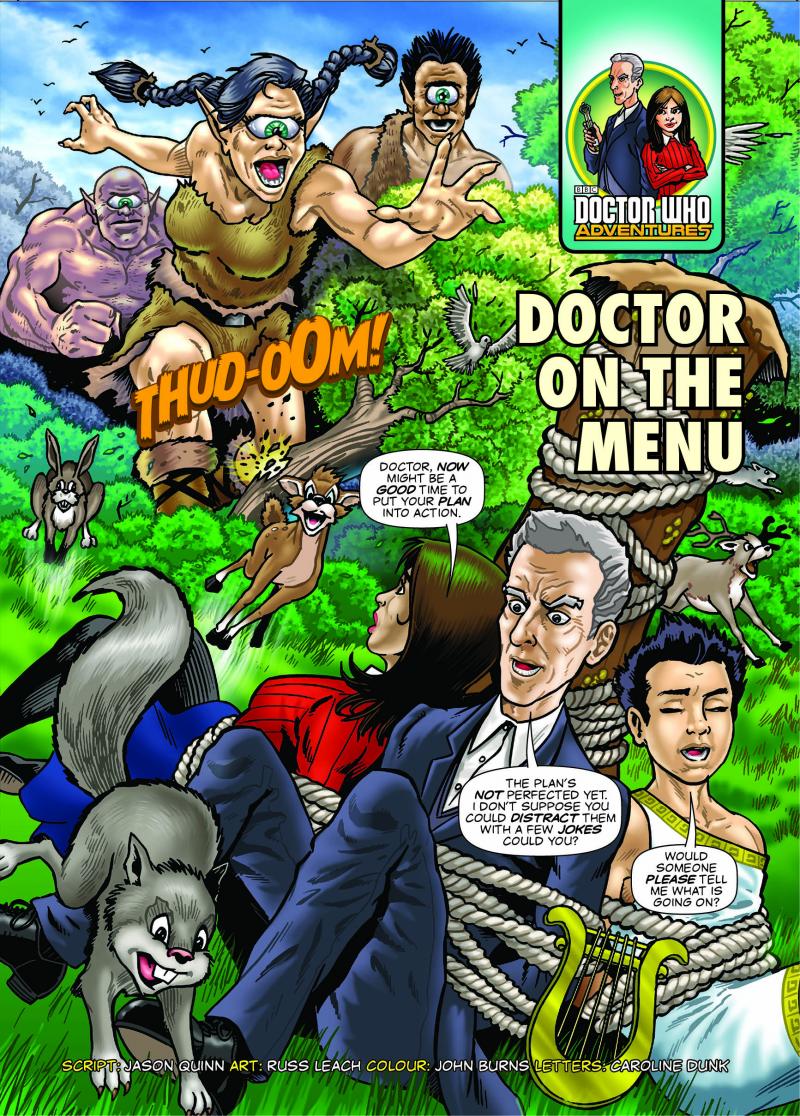 When Clara asks the Doctor to introduce her to Homer, he whisks her off to Ancient Greece where our heroes soon find themselves on the menu for a tribe of hungry Cyclopes. Doctor on the Menu is drawn by Russ Leach, written by Jason Quinn and coloured by John Burns.