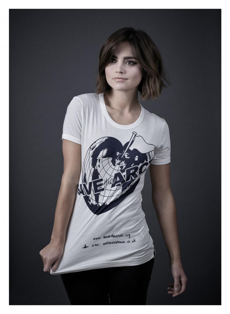 Jenna Coleman models a Vivienne Westwood-designed t-shirt for the Save the Arctic collection, shot by celebrity photographer Andy Gotts MBE (Credit: Andy Gotts MBE/Greenpeace)
