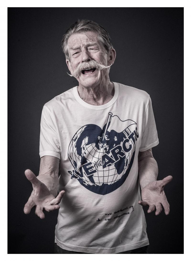 Sir John Hurt models a Vivienne Westwood-designed t-shirt for the Save the Arctic collection, shot by celebrity photographer Andy Gotts MBE (Credit: Andy Gotts MBE/Greenpeace)