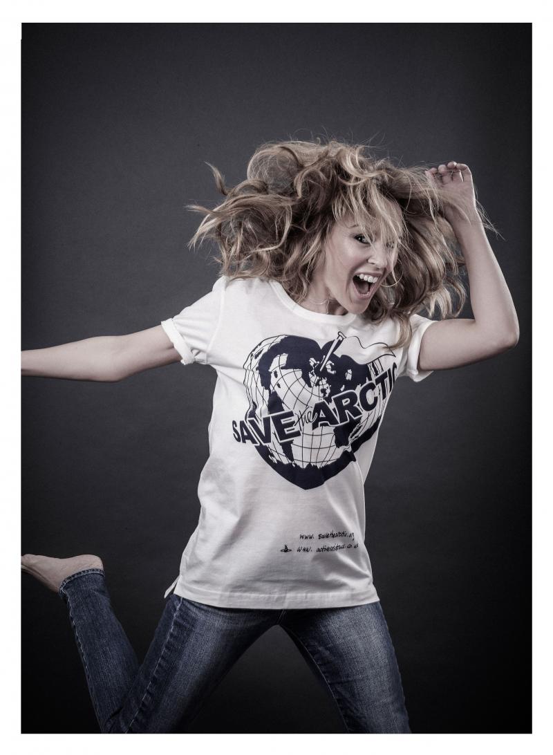 Kylie Minogue models a Vivienne Westwood-designed t-shirt for the Save the Arctic collection, shot by celebrity photographer Andy Gotts MBE (Credit: Andy Gotts MBE/Greenpeace)