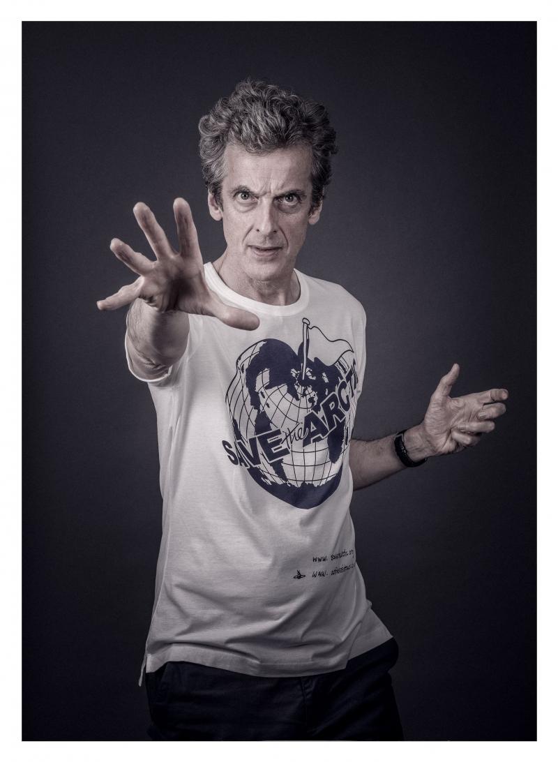 Peter Capaldi models a Vivienne Westwood-designed t-shirt for the Save the Arctic collection, shot by celebrity photographer Andy Gotts MBE (Credit: Andy Gotts MBE/Greenpeace)