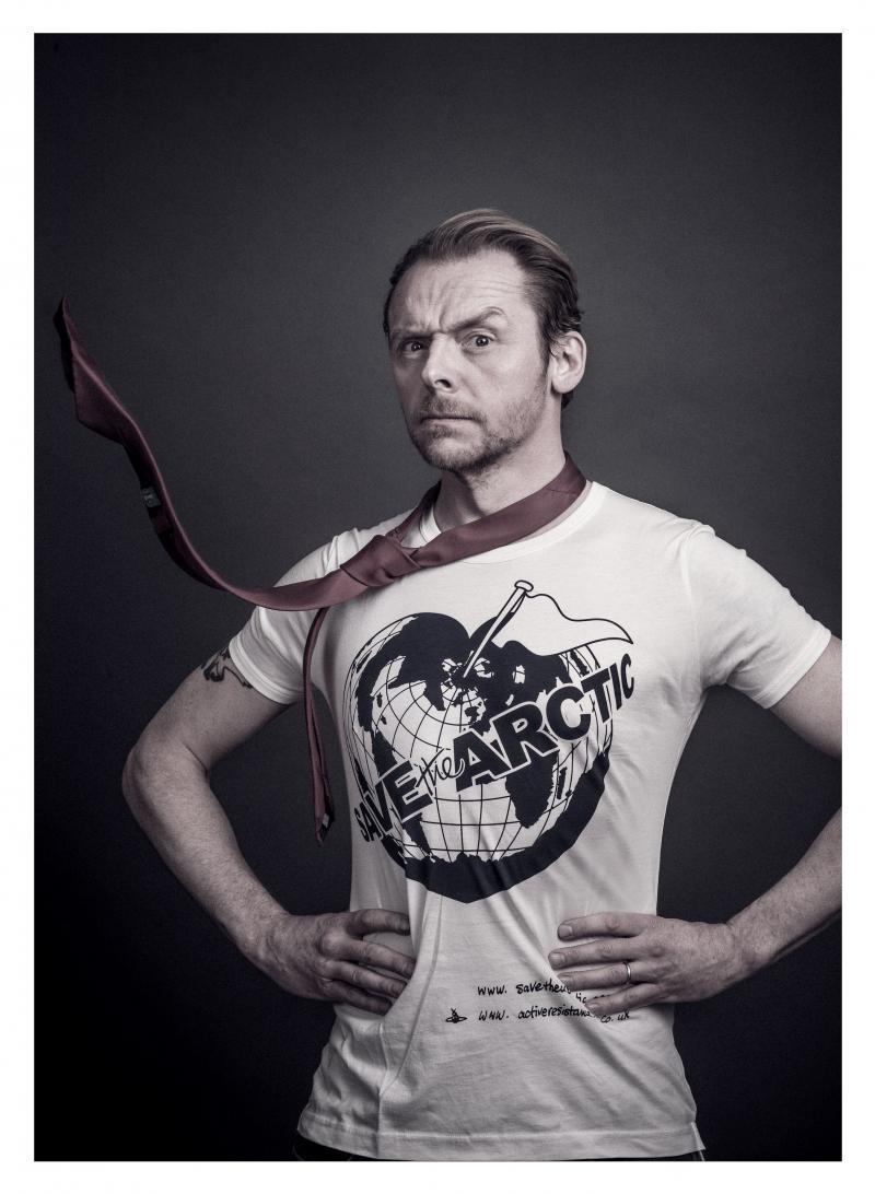 Simon Pegg models a Vivienne Westwood-designed t-shirt for the Save the Arctic collection, shot by celebrity photographer Andy Gotts MBE (Credit: Andy Gotts MBE/Greenpeace)
