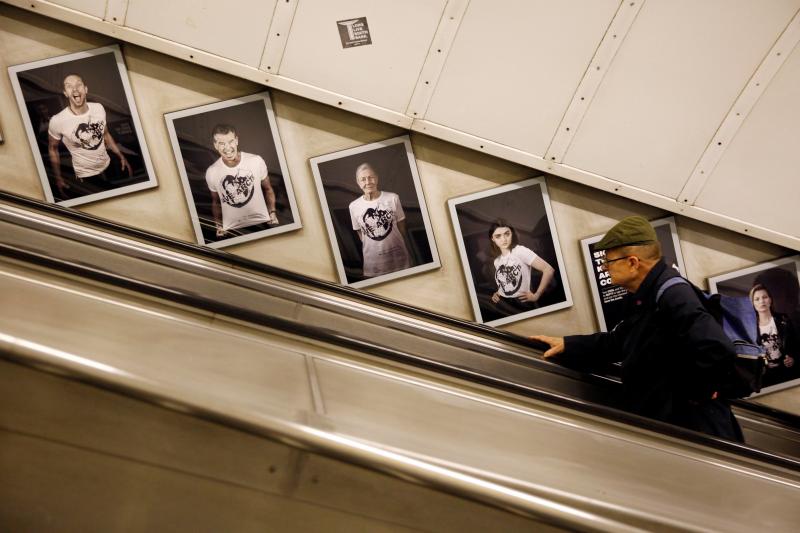 xhibition launch at Waterloo underground station showing photographs of celebrities by Andy Gotts . The celebrities are wearing T-shirts designed by Vivienne Westwood. (Credit: David Sandison / Greenpeace)