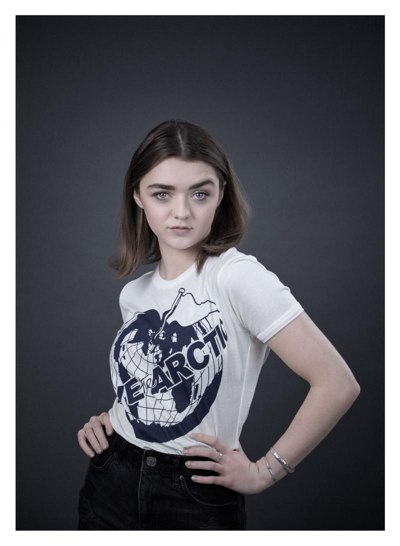 Maisie Williams models a Vivienne Westwood-designed t-shirt for the Save the Arctic collection, shot by celebrity photographer Andy Gotts MBE (Credit: Andy Gotts MBE/Greenpeace)
