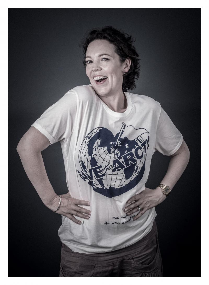 Olivia Colman models a Vivienne Westwood-designed t-shirt for the Save the Arctic collection, shot by celebrity photographer Andy Gotts MBE