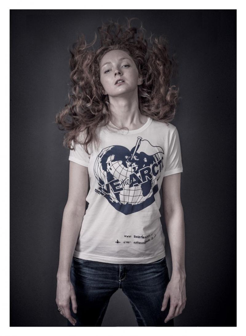 Lily Cole models a Vivienne Westwood-designed t-shirt for the Save the Arctic collection, shot by celebrity photographer Andy Gotts MBE (Credit: Andy Gotts/Greenpeace)