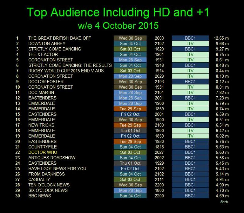Doctor Who ended higher than Casualty, which beat it in the initial overnight figures, and was the third most watched show on Saturday Night. The Great British Bake Off topped the chart with a massive 12.65 million watching. The most popular Saturday night show was Strictly Come Dancing with 9.27 million viewers.