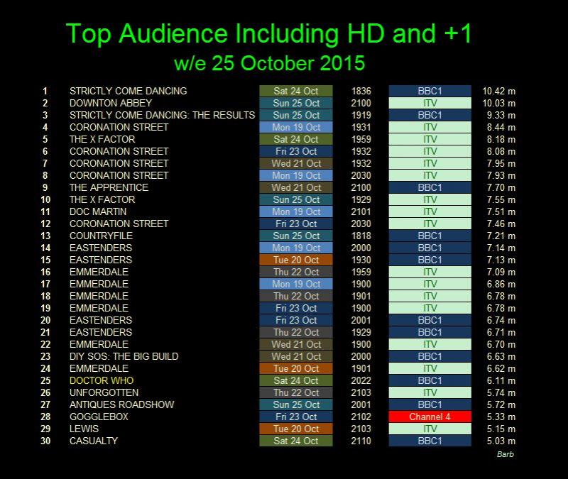 Top of the week was Strictly Come Dancing with 10.42 million watching.