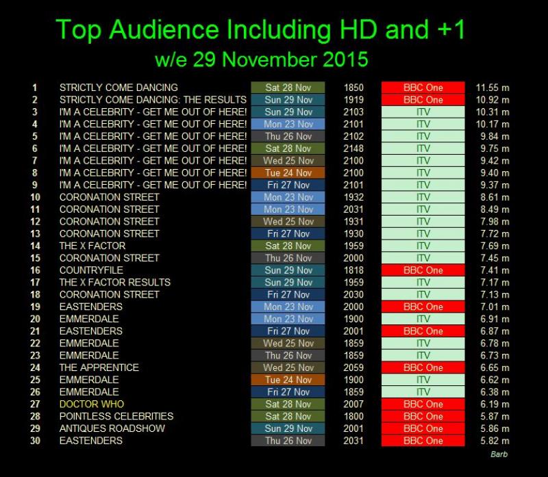 Strictly Come Dancing topped the ratings for the week with 11.55 million viewers. Once again the top ten was dominated by the latest series of I'm a Celebrity, Get me Out of Here taking seven of the top ten places.