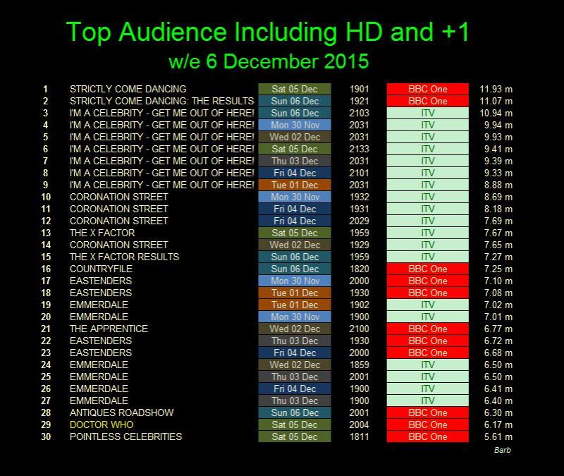 Strictly Come Dancing topped the ratings for the week with 11.93 million viewers. Once again the top ten was dominated by the latest series of I'm a Celebrity, Get me Out of Here taking seven of the top ten places.