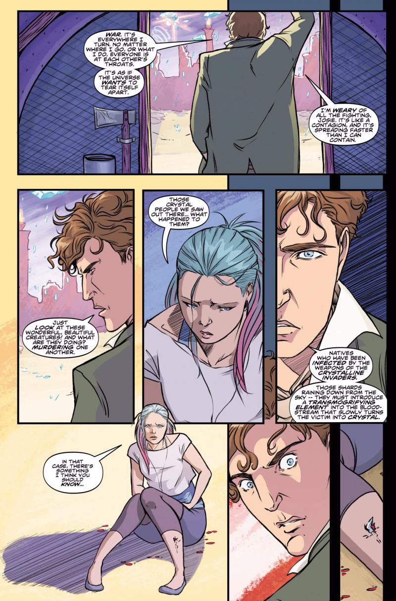 The Eighth Doctor and Josie Day start a universe-wide investigation! First stop – Lumin's World, home to a raging war between the near-extinct Calexi and the crystalline Spherions! When Josie is wounded in the crossfire, it's up to the Doctor to strike a peace – and find a cure – before she dies!