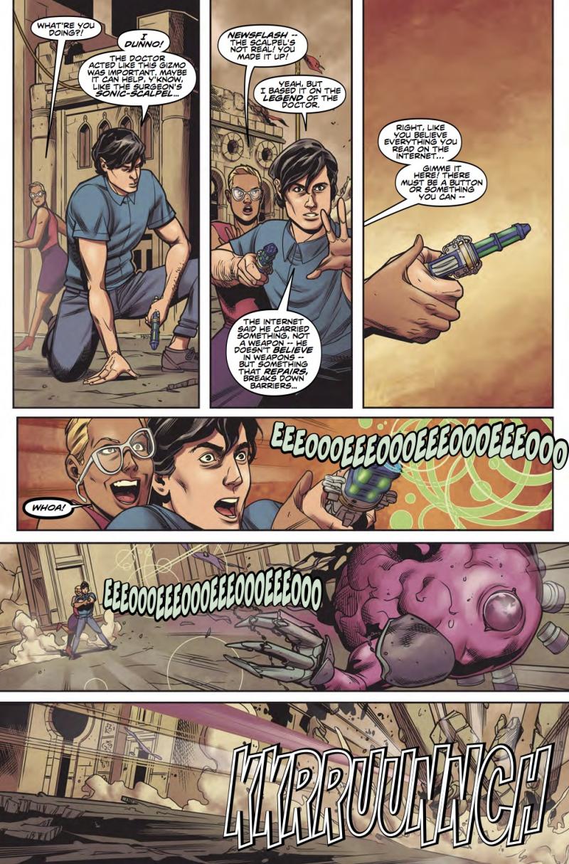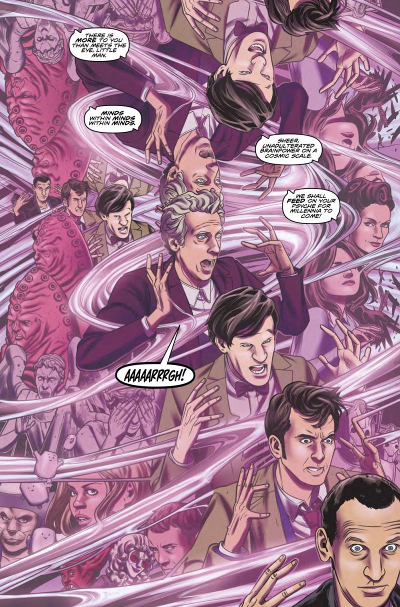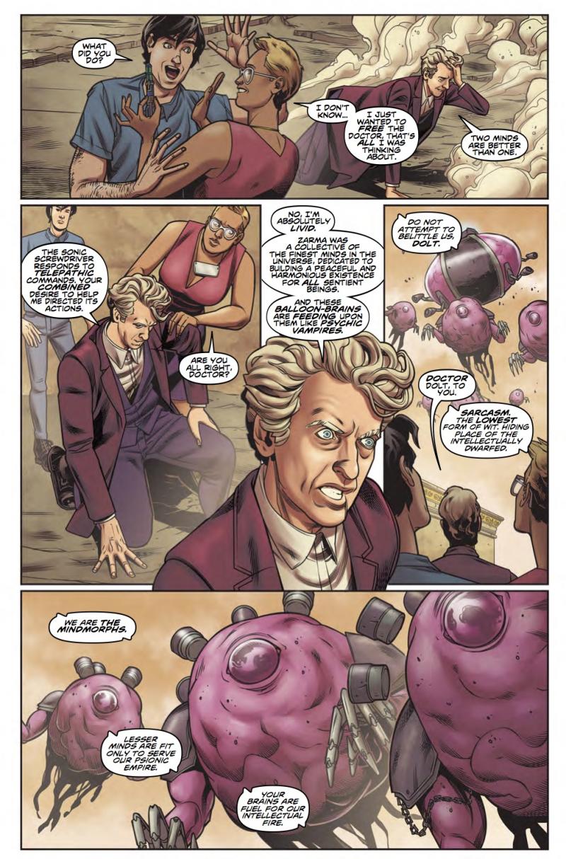 The Doctor and his new comic creator friends Sonny and Val are threatened by the maniacal Mindmorphs. Can they save the Doctor in time - before he loses his mind?! Featuring art from Rachael Stott, and penned by Robbie Morrison