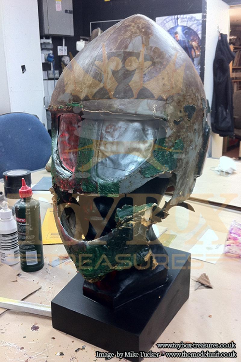 In preserving the Ice Warrior’s head, all existing pieces were used. Colours were matched for age with layers of silver paint added for an exhibition removed, revealing the orange eye sockets.