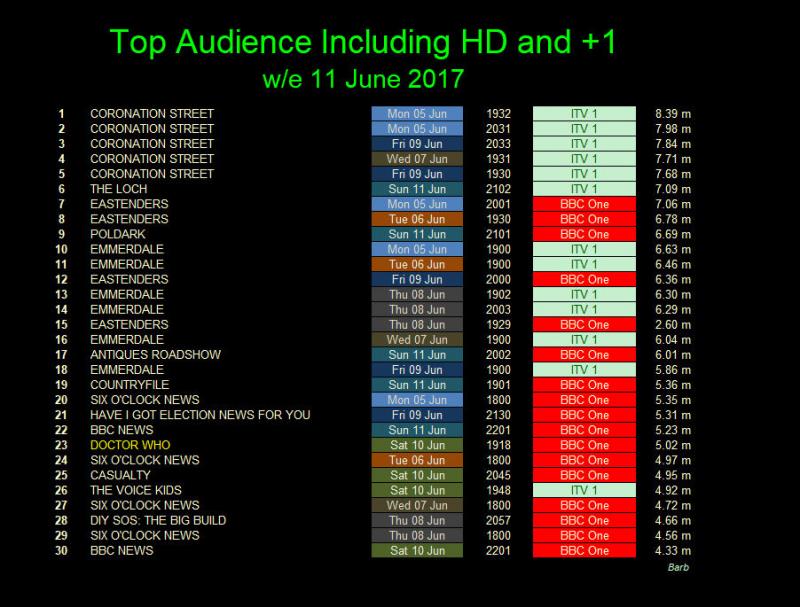 Top for the week was Monday's edition of Coronation Street which had 8.39 million watching. Emmerdale and EastEnders also scored highly as did the ITV drama The Loch.