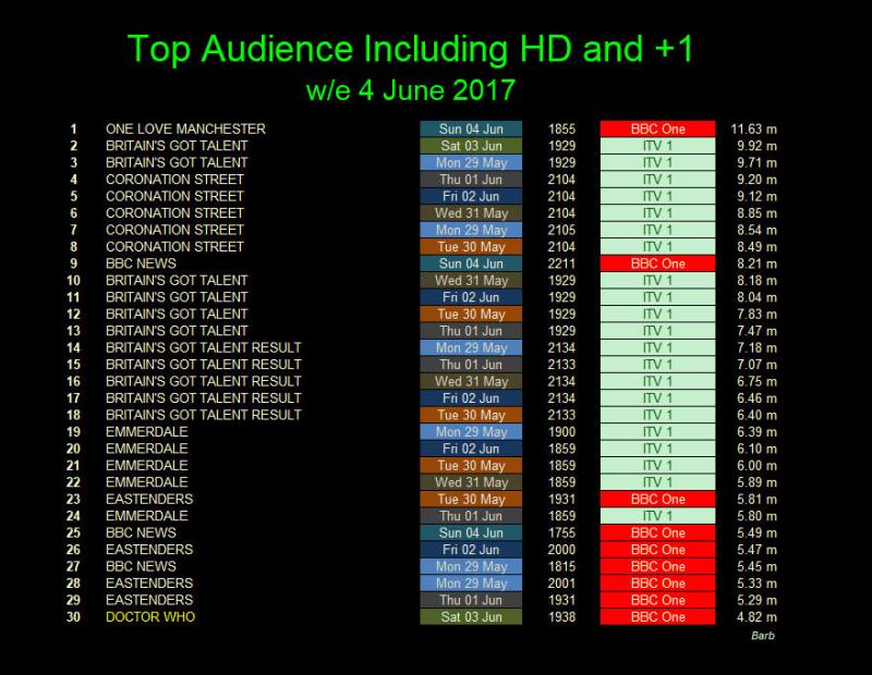 The week was dominated by the ITV talent show, with the various heats, shown throughout the week, dominating the chart. Britain's Got Talent, however, didn't take the top spot. That was achieved by the concert One Love Manchester, held to honour and raise money for the victims of the Manchester terrorist attack, which had 11.63 million watching.