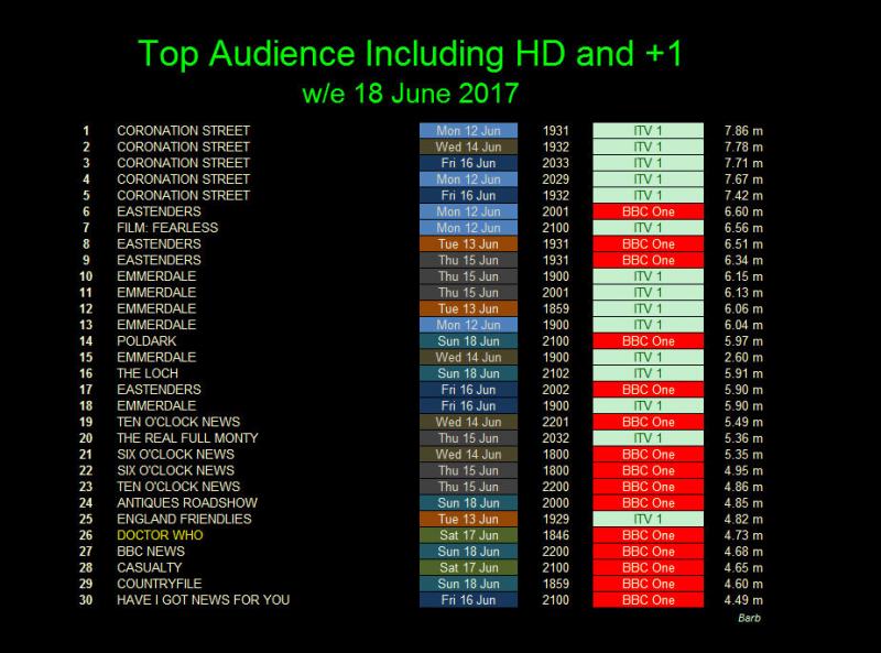 Top for the week was Coronation Street with 7.86 million watching. The BBC's highest rated programme was EastEnders with 6.6 million viewers
