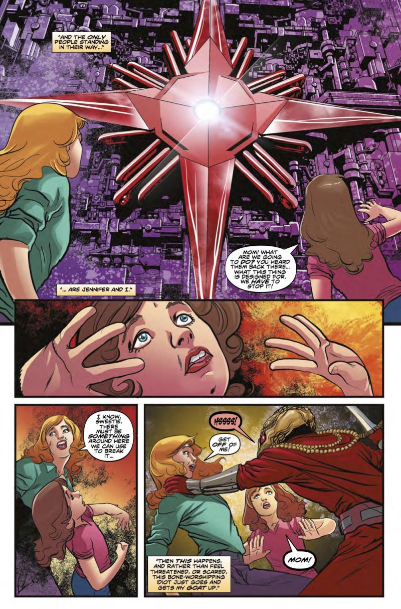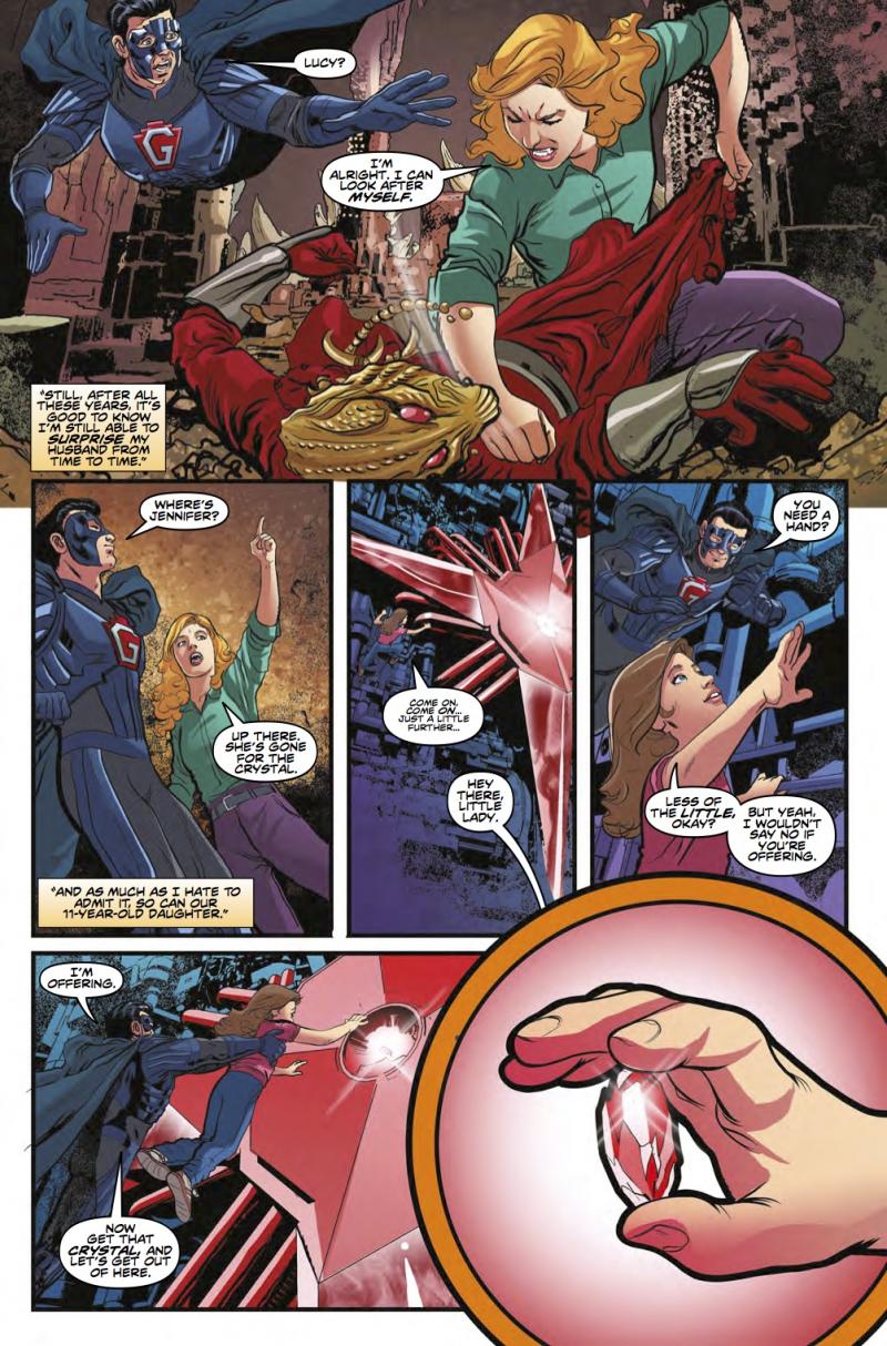 The Doctor is back in the lives of Grant, Lucy, and their daughter, Jennifer! He’s on a mission to find the other three alien gemstones, siblings of the one that gave Grant his superheroic powers – and only Grant can lead the way! Following the gems’ trail through time, the four ended up battling the fearsome entity known as THE SMOKE, and freeing a world from the Harmony Shoal – reclaiming two gems in the process. With just one gem left to find, the team fell right into the laps of the Sycorax! Now they’re trapped aboard the Sycorax flagship, as a doomsday weapon begins to fire...!