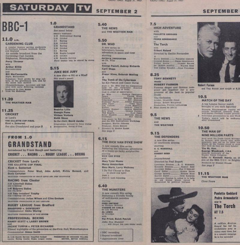In 1967 Saturday night television looked very different to today. After live sport in Grandstand, Juke Box Jury assessed the hits of the day. Doctor Who then led the BBC 1 Saturday evening schedule, which was still very much dominated by American imports. Match of the Day carried the football highlights and after a talk on the history of the Trade Union Movement, the station closed down and the nation went to bed at 11.15pm.