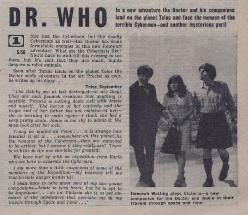 The focus of the cover was firmly on the adversaries the Doctor would face in the new series. The Cybermen were returning for the third time in less than a year. Inside an article promised new adventures along with a new threat, the Cybermats.