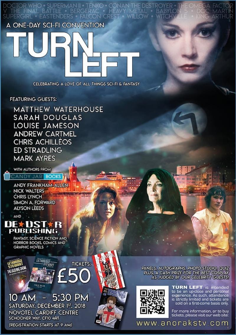 Turn Left also features Louise Jameson, Matthew Waterhouse, film actress Sarah Douglas, illustrator and painter Chris Achilléos, former Doctor Who Script Editor Andrew Cartmel, and music composer Mark Ayres.