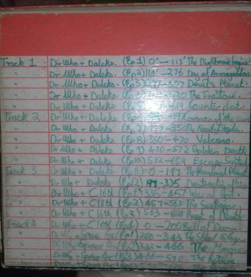 Unless otherwise stated, episodes include cliffhangers, reprises, and themes. Most appear to be line recordings (or, at least, very close-mic’d). First half of the first episode of The Daleks’ Master Plan is missing. There are two big faults during the recording of episode 3 of The Ark.
