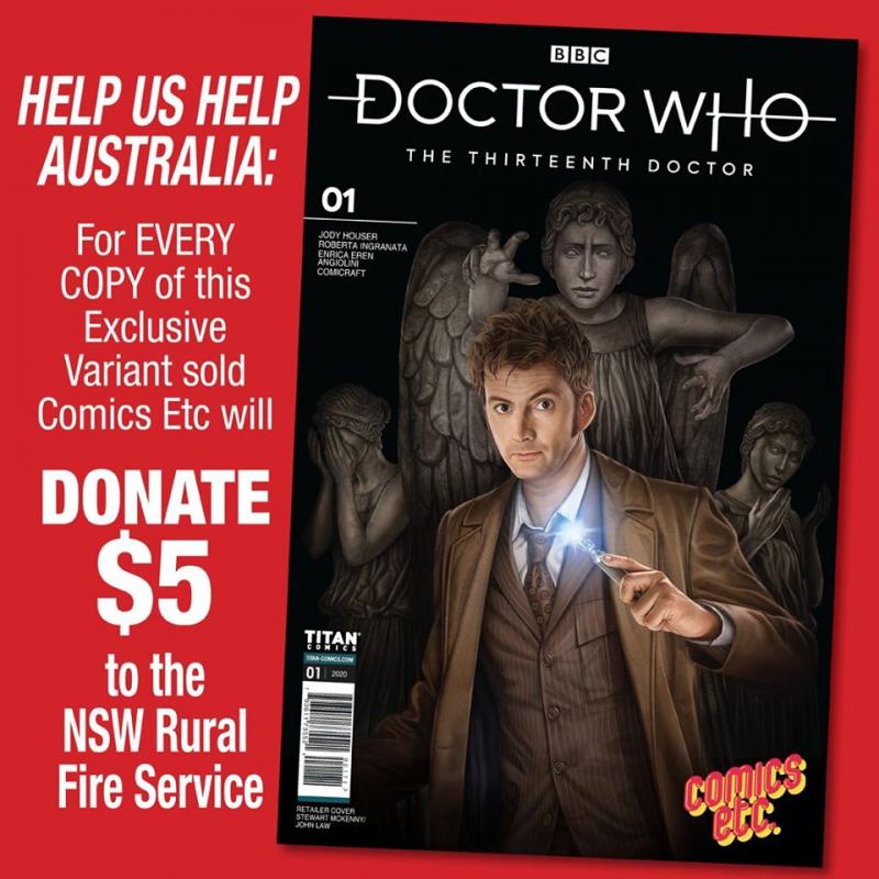 Comics Etc is donating $5 to the New South Wales Rural Fire Service for each copy purchased of this variant comic. Wendy and I are constantly overwhelmed by the support that you guys give us, and we're really hoping that you can get behind this comic. We're hoping that every cent donated through the sales of this comic will, in some way, make a difference, and bring some hope, to the country during this desperate time - and what is Doctor Who if not a symbol of hope?